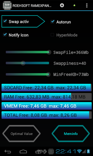 | Advantages of this app: - Free SD card memory as a RAM use (SWAP RAM / SWAP MEMORY) - Swapfile RAM expansion up to 4.0 GB (file system limit) - No limit on SWAP partition! - The usual performance degradation when paged not occur with sd card from class-8 - Widget for PNP swap (swap on / off swap) - Detailed Memory Information & Analysis - Autorun - Swappiness kernel parameter set - Easy foolproof use (1 click optimization and automatic calculation) - Supporting Tung all Android devices (root access and Kernelswap support) |